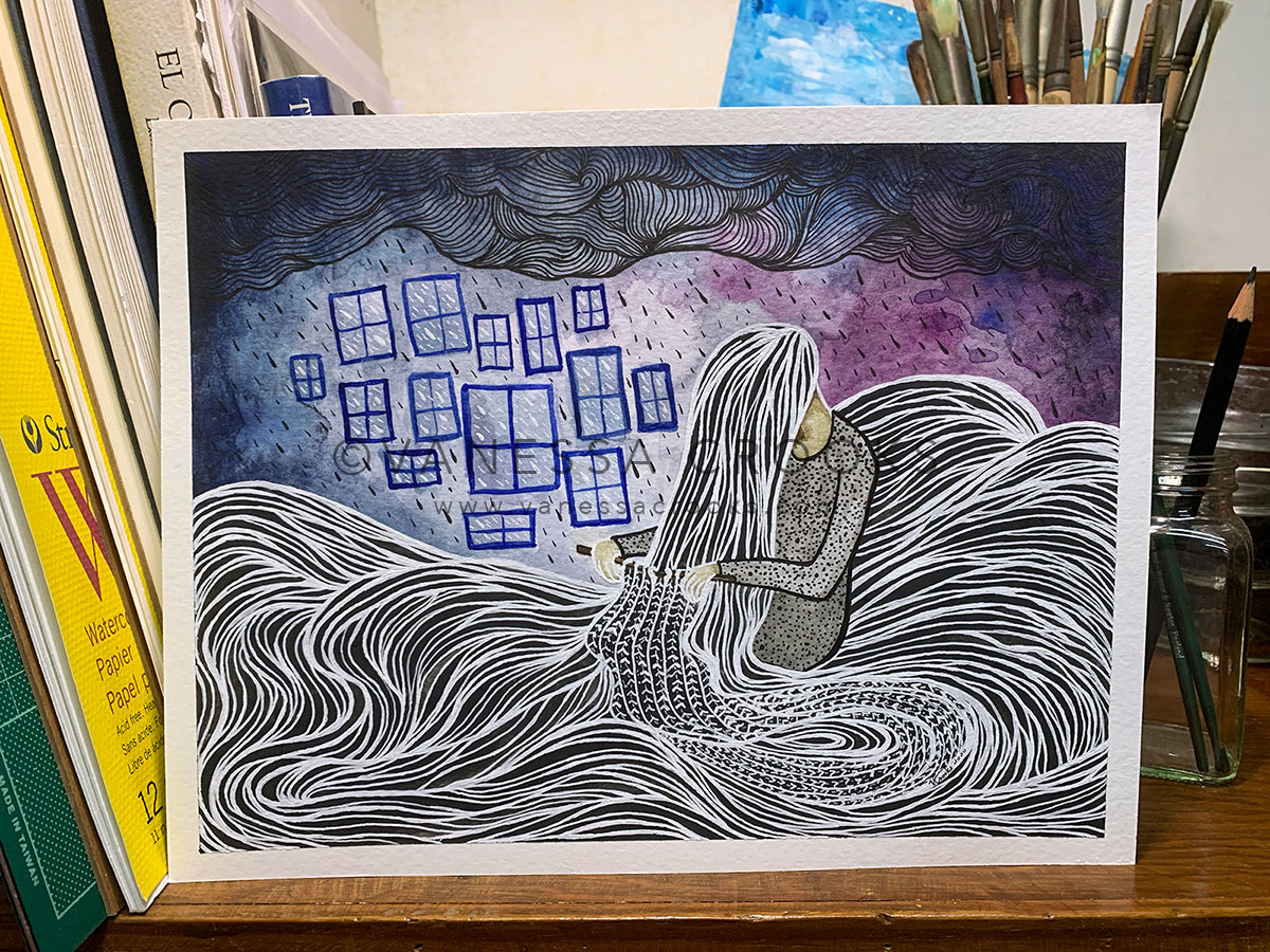La segunda obra dentro de la serie “Inside/Adentro”, inspirada en la pandemia y sus efectos en la salud mental, se llama “Unravelling/Desenredando”; cuando Inside/Adentro” representa el agobio del encerramiento y el miedo a la enfermedad que está “allá afuera”, esta obra representa lo que hacemos para sobrellevar y sobrevivir. Una crisis de salud mundial que pensamos que duraría unos cuantos meses se ha extendido indefinidamente, y como no hay un final a la vista, nos desesperanzamos cada vez más. La rutina se ha deshecho, los protocolos se han reestructurado dentro y fuera de casa, las cosas no son las mismas, y todo esto conlleva un deterioro mental y emocional.
